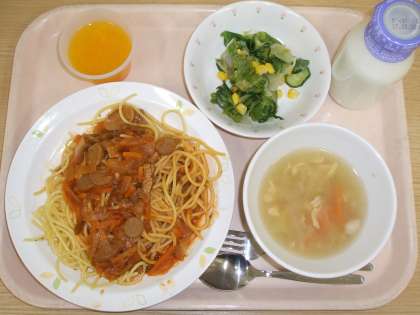 初夏のような暑さの中、給食室でも暑さと格闘しながら調理作業をしています。特に、スパゲッティを茹でるのは大変なものです。今日はハーブをきかせたピザソース味でいただきました。