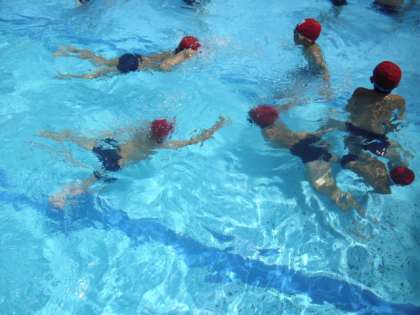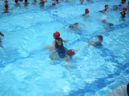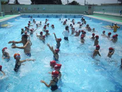 水掛け遊びでは、先生たちもいっしょに参加しました。水中ジャンケンをして友達の下をくぐります。楽しそうです。明日の検定もがんばりましょうね。