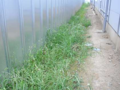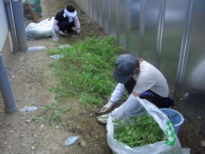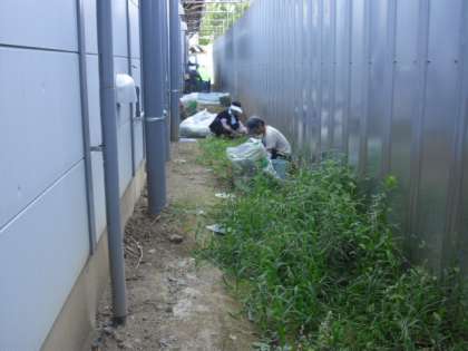 清掃や水泳教室の登下校時の安全指導の合間を縫って、今日は、校舎と校舎を囲む壁の間に生えている雑草の草むしりをしている主事さん。普段は、人があまり入らないところですが、見通しがよいと安心・安全です。
