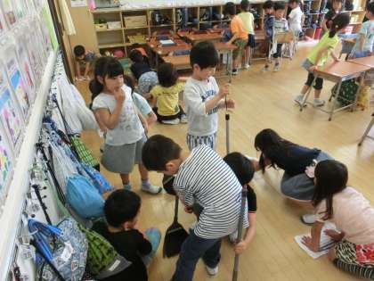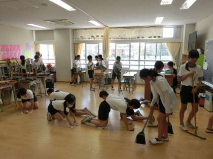1年生のみんなは、整美委員の説明通り、「ヘビのように」雑巾がけをしていました。