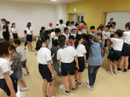 体育館入口付近では、6年生がハイタッチをしながら、入場してくるみんなをお出迎えしています。