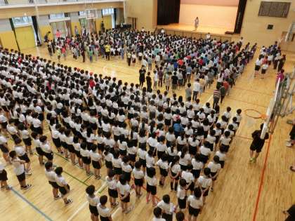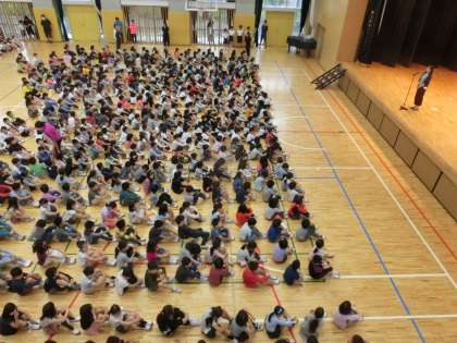 週番の先生が舞台に立つと、黙っていても体育館全体が静寂に包まれていきます。毎週、その素晴らしさを先生方から褒められている芦花小のみんなです。