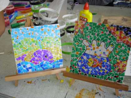 描いた絵によっては細かい部分があり、貼りつけるのがなかなか難しいところもありましたが、子どもたちはゆっくりと丁寧に作業を進めていました。色を付けたペットボトルの素材と光沢が、描いた絵に立体感を与えます。すてきな作品になりました。