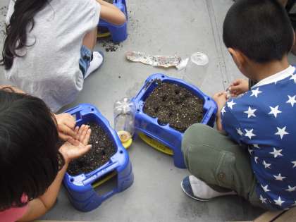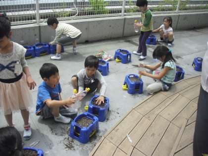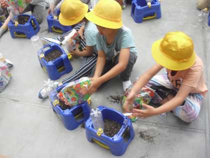 広いテラスで芦花中学生の体育祭で頑張る様子を目にしながら、1年生があさがおの種まきをしていました。土を入れて人差し指で穴をあけて、種を入れて、そっと土をかけ水をあげて・・・