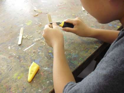 後半の4年生から6年生までのクラスは、実際に竹をカッターで削って竹とんぼ作りに挑戦しました。羽の角度や厚さを調整しながら削るのでなかなか難しいのですが、子どもたちは熱心に取り組みました。