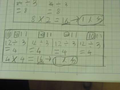 48を30と18に分けて30÷10、18÷3ならできる・・・と、今までの経験をもとに解決方法を考え、発表していました。