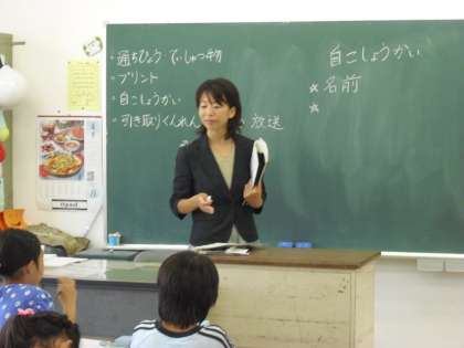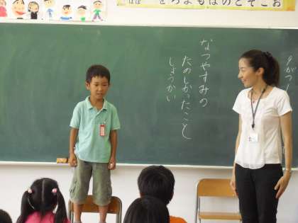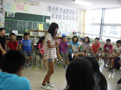 それぞれのクラスで、夏休みの思い出を伝える活動を行っています。一人ずつ前に出て話をするクラスやグループで話し合っているクラスもありました。6年生ではゲームと組み合わせて夏休みの思い出を伝えているクラスもありました。