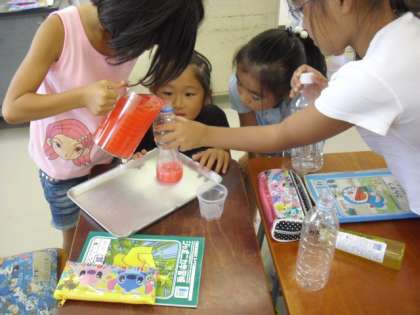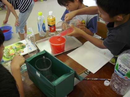 3年生の算数の授業の様子です。水の「かさ」についての学習です。色水を使いながら大きさや形の異なる容器を用いて、どちらの容器の方が多く水が入っているのか調べていきます。計量カップで正解を確かめます。算数の学習では、理解をより一層深めることができるように具体物を用いた授業を展開することを心がけています。