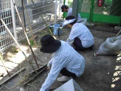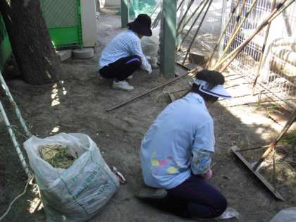 様々な仕事の合間をぬって、今日は南門側の受水タンクの裏の雑草を除去しています。根が強くはっているので、力がいります。小さな草もていねいにとっていきます。見えない部分もすっきりです。