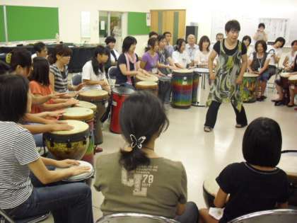 中学校の第2回家庭教育学級の様子です。今回は、音楽教育家の飯田和子先生を講師にお招きし「ドラムサークル」を行いました。小学校の児童や保護者も参加しました。飯田先生は、ドラムサークルファシリテーターとして、年齢・障害・人種・経験等の人を分かつすべてのラインを取り払ってみんなで楽しめるリズムコミュニケーション「ドラムサークル」運動を学校やPTA、地域コミュニティ、障害者・高齢者施設等で展開されています。ドラムを通して、音を合わせながら心も合わせていきました。
