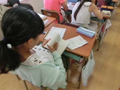 画像は、オススメ本カードへの記入を行っている6年生の様子です。さすが最上級生、内容の質だけでなく、文字も絵も見映えが違いますね。