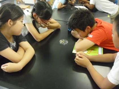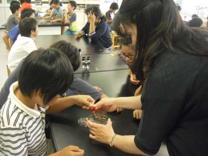理科室で5年生が実験中〜種子の中の子葉には何が含まれ、どのような働きをするかについての学習です。ヨウ素液を使って、でんぷんがあるかどうかじっくり観察し調べていました。