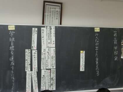 議題「学級目標を決めよう」の話し合い活動です。司会グループのリードのもと、5回目となる学級会が進行していました。