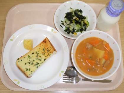 「グリーンサラダ」は、材料の1つに“生わかめ”を使っています。しょうゆベースのドレッシングでサッと和えると、ねばりが出ずにおいしく作ることができます。。