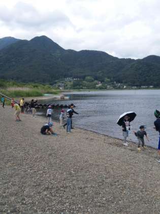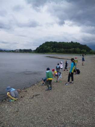 湖で過ごすひと時・・水面に石をはわすように投げようと、みんなが投げ方を工夫しています。