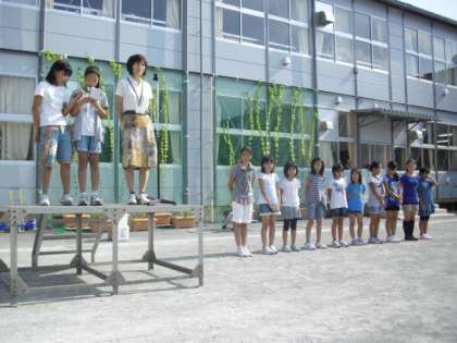 全校朝会の様子です。芦花小学校のスポーツ教室バレーボールチームが、日曜日の大会で4位になったことを校長が紹介しました。また、部員が少ないので5年生のキャプテンから、部員募集の呼びかけも行いました。入部は4年生以上です。