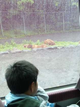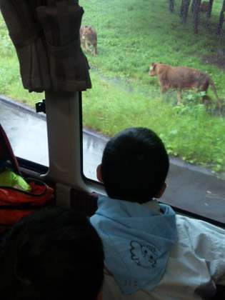 バスに乗って動物たちを見学〜動物を見つけては歓声をあげています・・