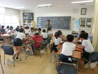 5年生が毎年行っている稲作体験にあたり、今年もゲストティーチャーにご協力をいただきながら、授業を進めています。