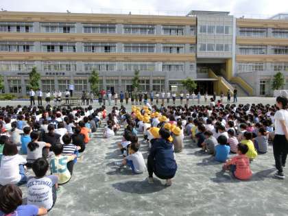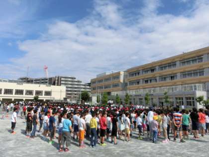 今朝はいつもの児童朝会ではなく、校庭に芦花の学び舎 芦花小学校の全児童と芦花中学校の全生徒が集まっての合同集会が行われました。小中施設一体型の2校(小中一貫校ではありません)ならではの取組です。