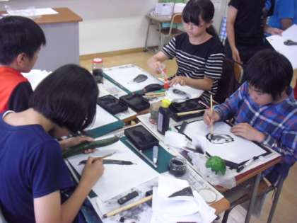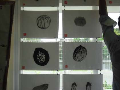 6年生の教室で自分の選んだ野菜を使って、濃淡を付けるなど墨で描く活動をしていました。それぞれの作品はなかなか味のある作品に仕上がっています。