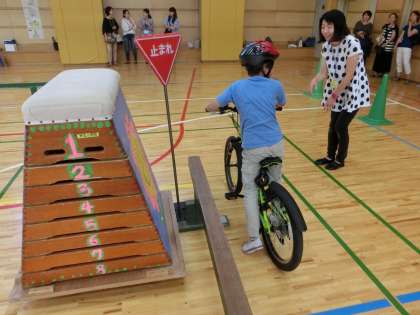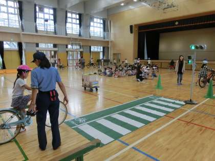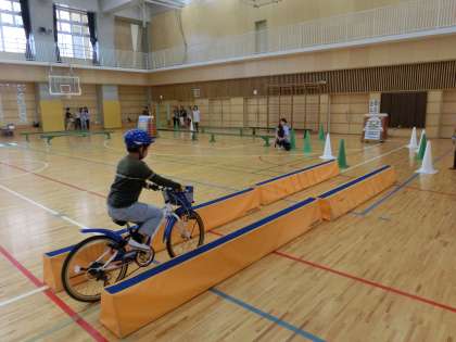 3年生の部は自転車走行訓練です。安全な乗り方だけでなく、自転車点検のポイントについてもご指導がありました。