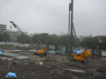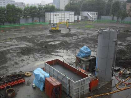 台風の接近に伴い、久しぶりにまとまった雨が降っています。工事現場にも水たまりができてきました。今日は、重機も動かず静かな工事現場です。並べられている掘削用のドリルが雨に打たれて洗われているようです。