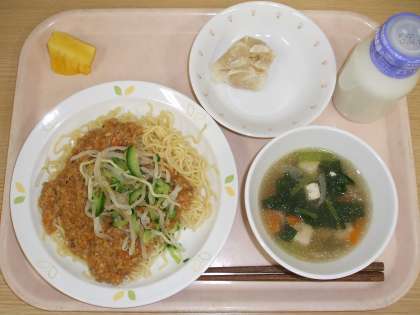 「ジャージャー麺」は、給食で人気のあるメニューの1つです。みそと砂糖で、少し甘めの味付けに仕上げました。もやしときゅうりを、彩りよく盛り付けたいですね。