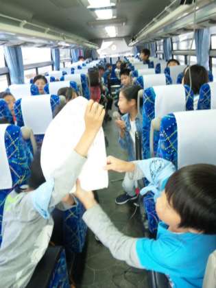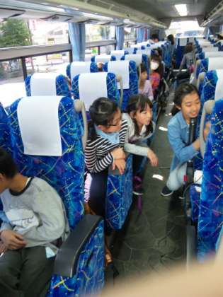 バスは関越自動車道を走り、川端に向かっています。車内ではレク係の子どもたちがリードしながら、クイズなどのレクを楽しんでいます。