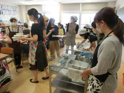 本日限定で、ぐっとアダルトな給食当番の皆様が、配膳台でスタンバイ。一方、テーブルでは、お行儀よく座って配膳完了を待っていらっしゃる方々の姿。さすが、大人たちはマナーをわきまえています。しかし、「いただきます」の挨拶に関しては、小学生の方が元気いっぱいの印象でした。