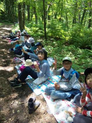登山の後は、みんなでお弁当タイム〜汗を流した後、お腹が空いているようでしっかり食べています。