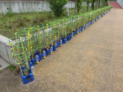 今朝、ズラリと並んだ鉢は雨で潤い、所々に赤い実が見え隠れしていました。今日は梅雨らしい空模様の一日になりそうです。プール開きは一休み。5年生が最終日を迎えた川場村の天気が気になります。