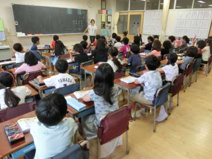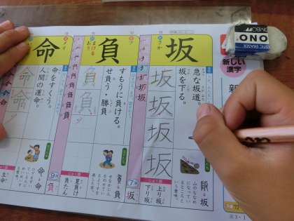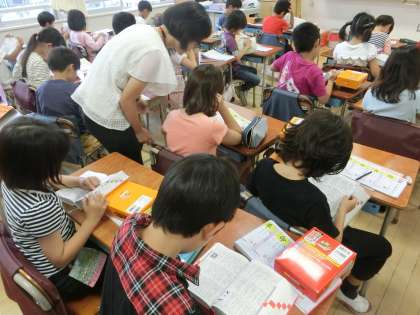 新出漢字「坂」「負」の学習です。この漢字が使われている言葉集めをする中で、意味が分からない「夏負け」「顔負け」が出てきました。子どもたちはすかさず、国語辞典を取り出し、謎を解決すべく調べていました。よい習慣が身に付いていますね。