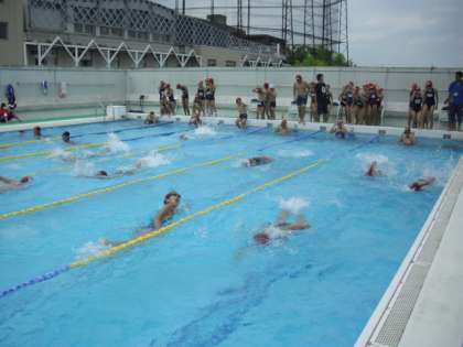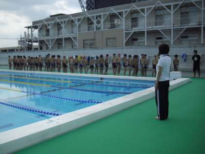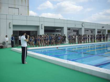 雲間から日差しが降り注ぎ、晴れ間が見えてきました。6年生の水泳記録会です。開会式では、校長が6年生のよさについて話しました。その話を真剣に聞く6年生。自分がエントリーした種目に全力で取り組みます。開会式の後は、水慣れです。
