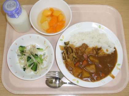 今日の「ポークカレーライス」は、香辛料が効いたちょっとピリ辛い味付けでした。手作りした「福神漬け」は、野菜のシャキシャキとした食感がよかったですね。