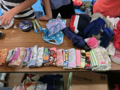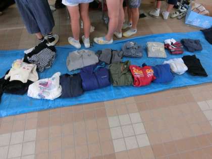 たくさんのユーズドが並ぶフリーマーケット? いえ、いえ、売り物ではなく、落としたまま取りに来てくれない持ち主を待っている、服やハンカチなどの品々でした。今朝の朝会で話があった悲しい落とし物をみんなで救いましょう! オーナーのもとへ無事に帰れることを願っています。