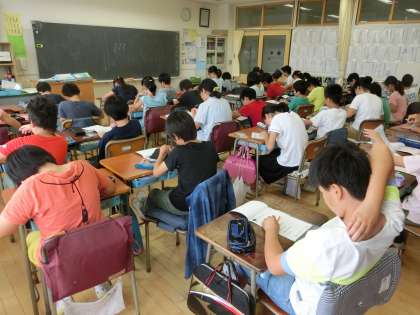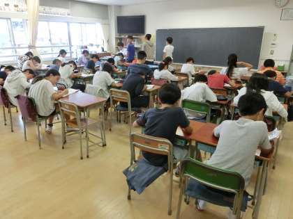 どんなに暑い日でも、現代の学校は空調完備です。涼しい教室で、8時25分からは『算数タイム』が始まりました。額の汗をぬぐいつつ、学習問題に落ち着いて取り組む姿が学校中で見られました。今朝は4・5・6年生の様子をお届けしましょう。