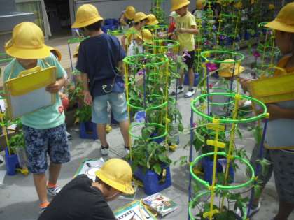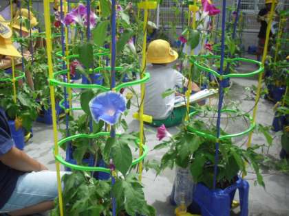 1年生が種まきをしてぐんぐん育った朝顔の花がきれいな花をつけています。今日はみんなで朝顔の成長の様子を記録していました。何色の花が咲いたでしょうか。これからもきれいな花がたくさんになるよう、しっかりお世話をしていきましょうね。