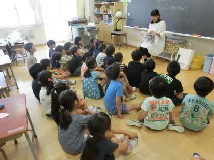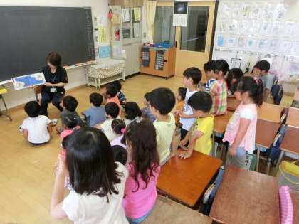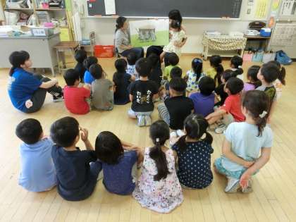 大型絵本が登場したり、タイムリーに七夕のお話が読み聞かせされていたり、各クラスでは、毎週木曜朝恒例の光景が展開していました。