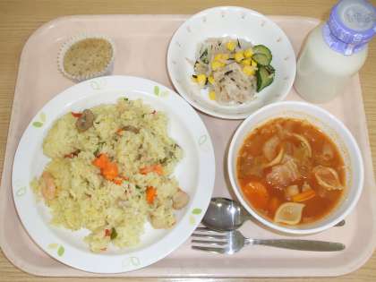 今日の給食は、スペインの代表的な米料理「パエリア」をいただきました。海の幸と山の幸をふんだんに使い、いろいろなうま味が感じられました。