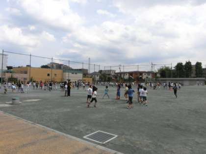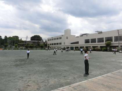 昼休みの校庭を職員室前から見渡した構図です。左手では小学生、右手では中学生が遊んでいます。トラブルなんてゼロ。いつも小中学生が仲良く、楽しいひとときを過ごしている昼下がりです。