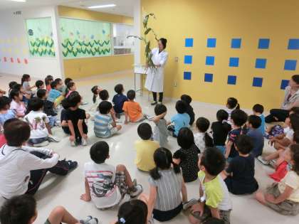 栄養士の富川先生から、大人の背丈ほどある、とうもろこしの実物を見せていただきました。野菜についてのお話をうかがった後、皮むきの始まりです。