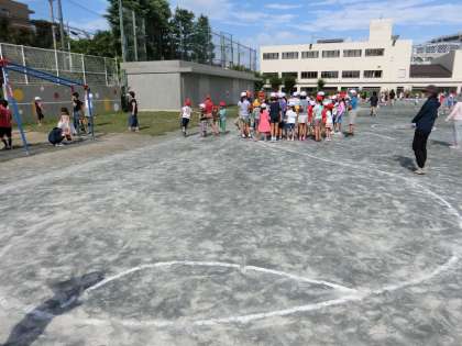 パートナー学級同士が集まり、挨拶やミーティングを済ませたら遊びの開始です。