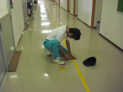 校舎内の廊下の安全な歩行のために貼ってある黄色のラインテープ。ところどころ破れていたり、はがれていたりするところなど、細かな部分も気が付いたらすぐに手入れをする主事さんです。