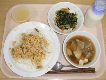 「ふわふわそぼろ丼」は、“凍り豆腐”をそぼろ状にしてご飯にかけた料理です。ふわふわの凍り豆腐の他には、鶏ひき肉、たまねぎ、にんじん、さやいんげんなどを使い、彩りよく仕上げました。