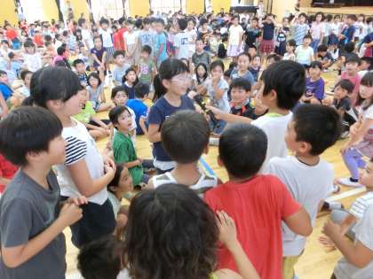 見事ビンゴを達成したクラスにはインタビュアが駆けつけ、それに答えたい子たちの輪ができていました。とびきりの嬉しさを表現していました。