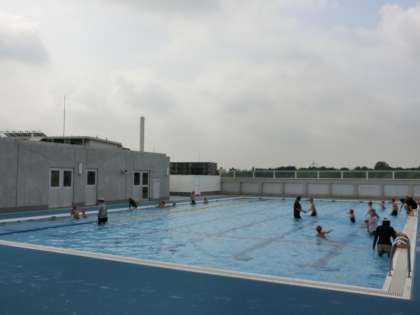 午前8時現在、気温28度、水温29度。今日もプールはグッドコンディションです。1学期の使用は本日が最終となります。