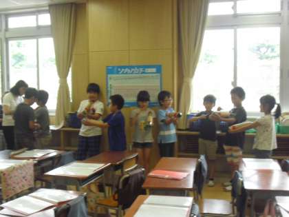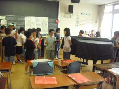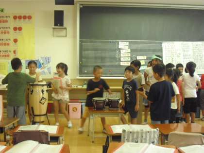 音楽室では、打楽器を手にして、子どもたちがリズムを刻んでいました。それぞれの楽器の「音」は違っても曲に合わせて皆でリズムを合わせると、「楽」しい雰囲気が伝わってきますね。「音楽」の活動のよさ、楽しさを十分味わっていましたね〜