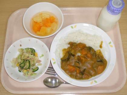 1学期最後の給食です。太陽の光をいっぱい浴びた「夏野菜」を使って、カレーライスを作りました。今回使った夏野菜は、かぼちゃ、トマト、なす、ズッキーニ、ピーマンです。まだまだ旬でおいしい夏野菜を、家庭でもいろいろな料理で食べてみましょう。