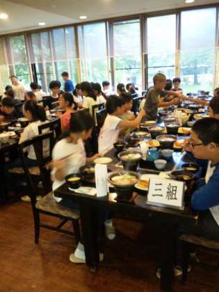 夕食を食堂で取りました。この後キャンプフアイヤーを湖畔に出かけ実施する予定です。