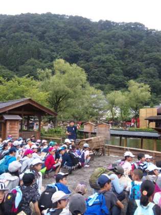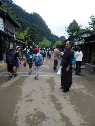日光江戸村に着きました。山をおりてきて、こちらの天気は現在曇り空です。江戸時代の生活、町並み、文化、服装などを再現した中で体験しながら学び、楽しんでいます。